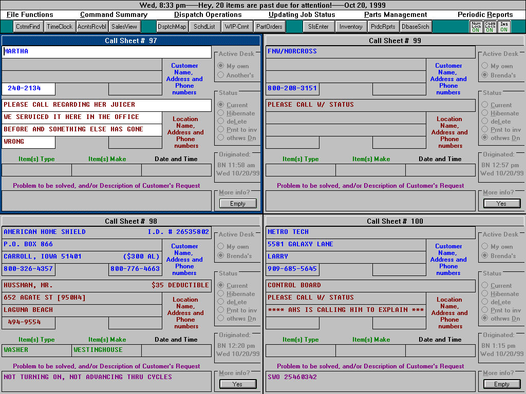 ServiceDesk provides a specific form for taking calls, named the Callsheet. Indeed, it provides four Callsheets to a screen-page (allowing you to see and use more information at once), on as many pages as you care to use. Upon receiving a call, your task is no more complicated than to move (using any of several instant methods) to the first unused Callsheet. Here, you'll find your cursor already positioned in the correct place for typing in the caller's name. Hit Enter and you'll be in position to begin typing the address. If no address is wanted, hit Enter twice again and you'll be in position to type a telephone number. Continue the sequence as you move into positions to type the kind of product (or situation) needing service, it's make, a description of the problem or request, and an appointment time if appropriate.