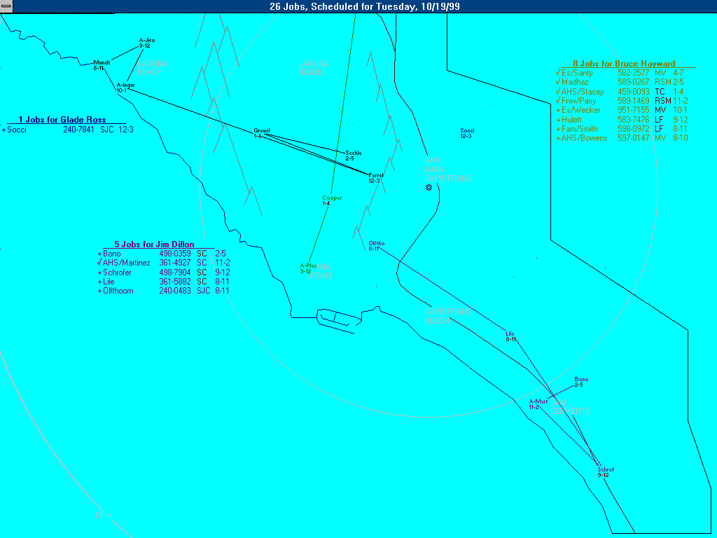 If scheduling for the same day doesn't fit, incidentally, it's no problem. Just hit your PageDown key and the map will display everything presently scheduled for tomorrow (with your present caller's location still brightly displayed in red), and so on.