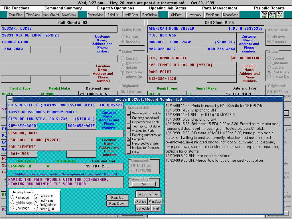 Do you work for home warranty clients? Is it a pain to type (or write) their entire data set (i.e., full name, billing address, telephone numbers, etc.) into each work order? With ServiceDesk, you can insert it all with one keystroke. Anything that reasonably can be done, ServiceDesk does for you, instantly. Indeed, ServiceDesk has many more conveniences to help get information into your Callsheet quickly and accurately. For the sake of brevity, however, let's discuss how it assists once that information is entered.