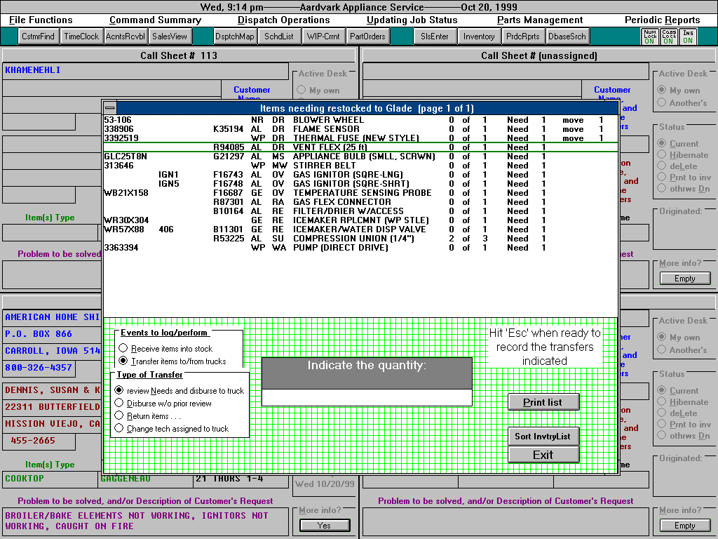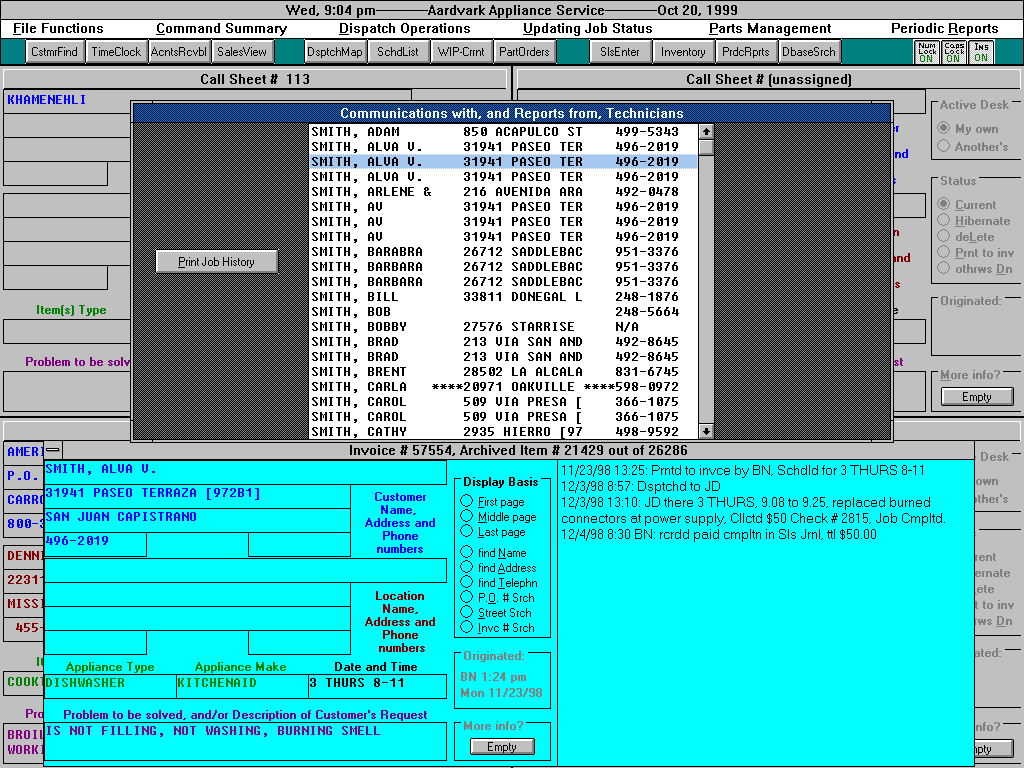 Without elaborating on the means, suffice it to say that, using similarly convenient methods, ServiceDesk helps you track the history and status of every job at every step on its way to completion. At the same time, it keeps track of the times each tech spends on the job, of the parts used from stock and those needing special ordered, of moneys collected, and so on. It further has utilities to manage restocking of trucks, restocking your office inventory from suppliers, placing and tracking orders for non-stock items, documenting and controlling the receipt and deposit of funds, etc. It's all there, and works extremely well. There is, indeed, a great deal more we won't take the time here to mention.