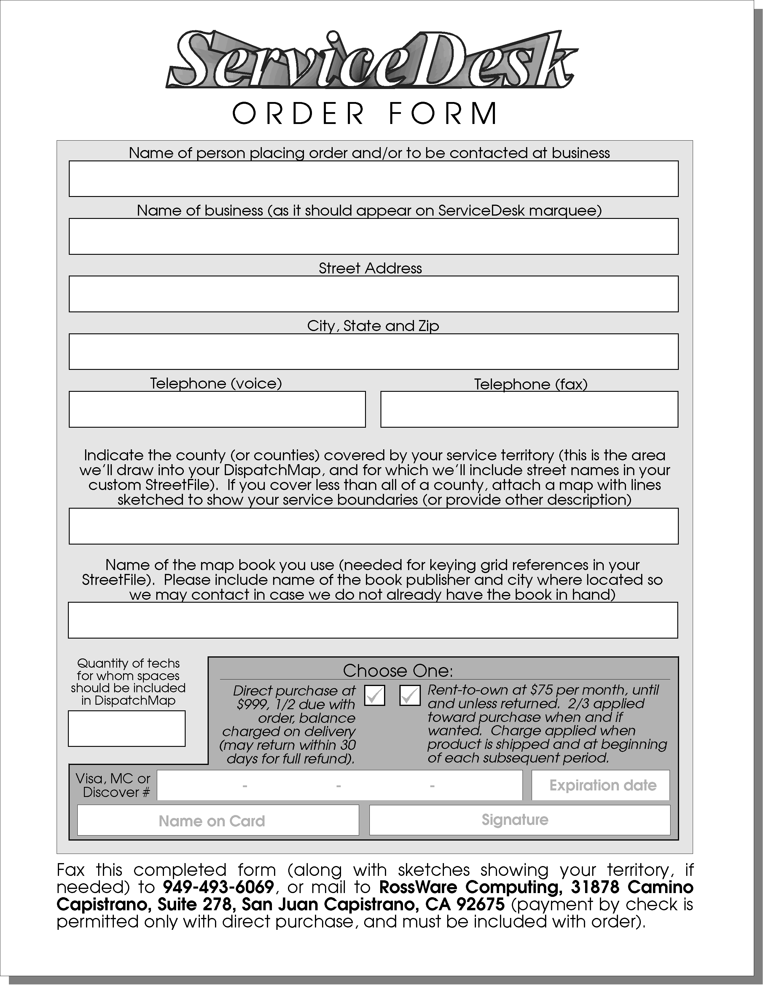 As part of your order, we need information concerning the map (or map book, if any) your technicians use in traversing your territory (needed if we're to reference its grid system in your custom StreetList), an indication of your territory boundaries (needed in building your on-screen DispatchMap), and an indication of how many technicians you have in your roster (we must build spaces for that many positions in your DIspatchMap). If you've asked us to send you a demo CD and info packet, it will include the order form on which you can fill-in these kinds of information. Otherwise (if, in other words, you wish to order immediately without first receiving our info pack), please click on the order form illustrated above. It will link to a .PDF document from which you can print a full-sized version onto paper. Please fill it out (yes, using old-fashioned pen and ink; sorry, sometimes that's just easier), then fax or mail to us.