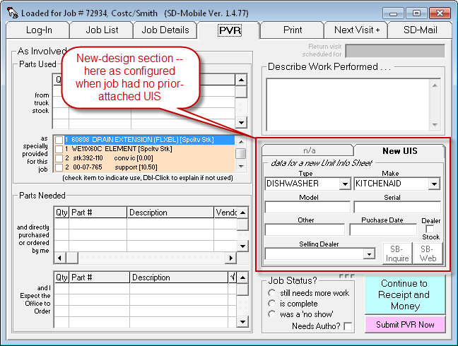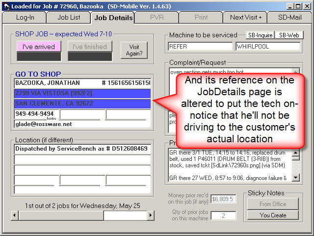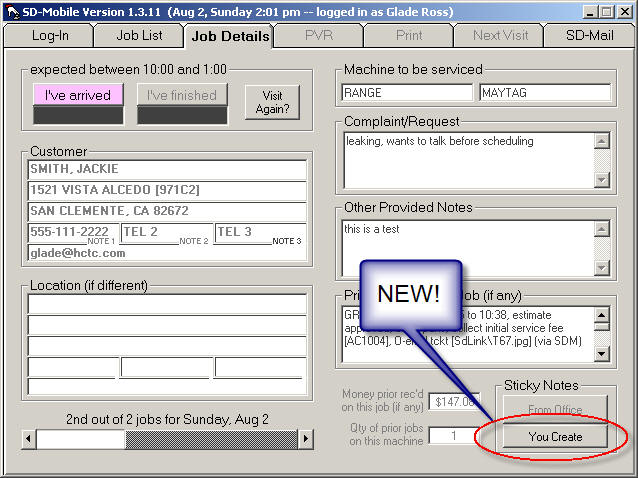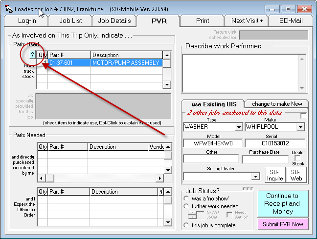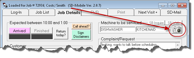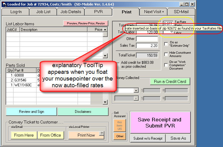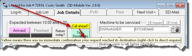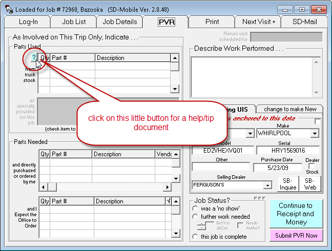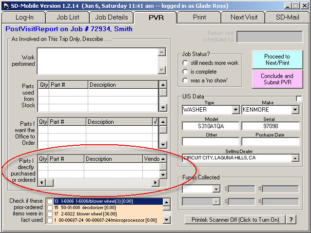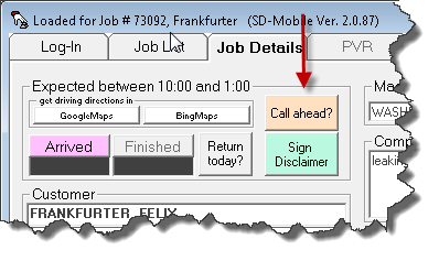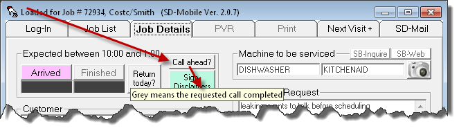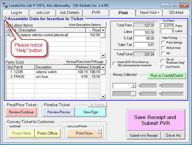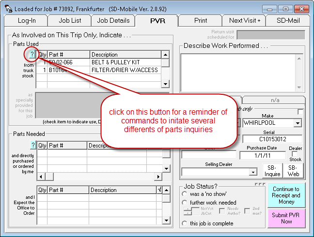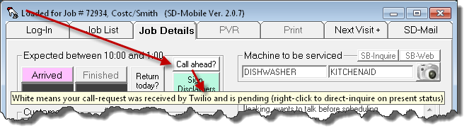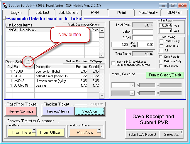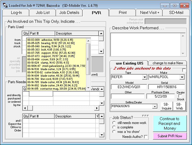 The last two tabs in the SD-Mobile interface are not yet operational at all (Print and SD-Mail). You'll notice there's a column in the JobsList to indicate quantity of parts the tech should be bringing in connection with the job. That likewise is not yet operational.
