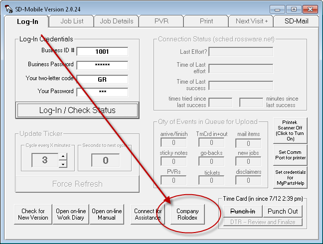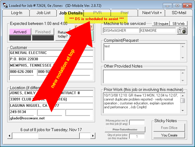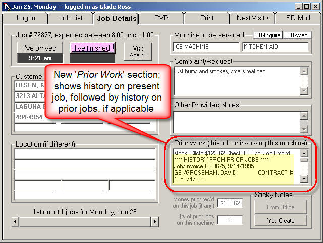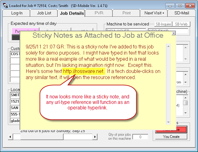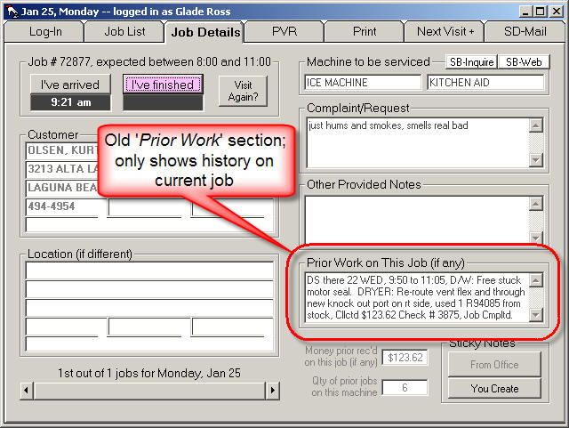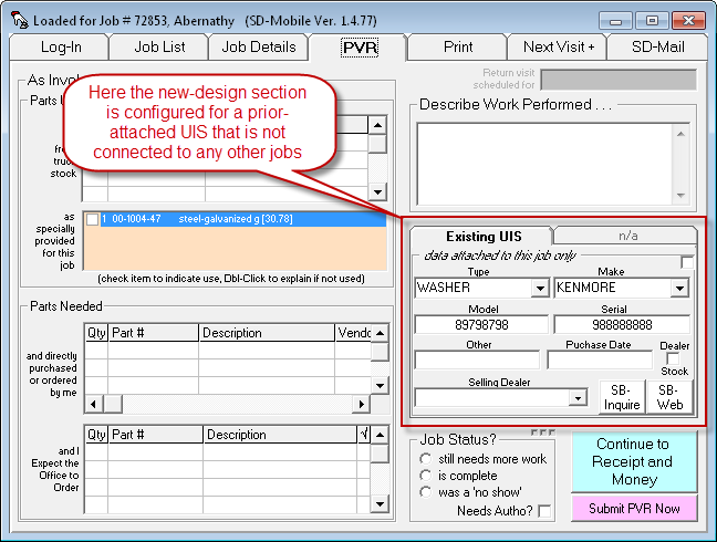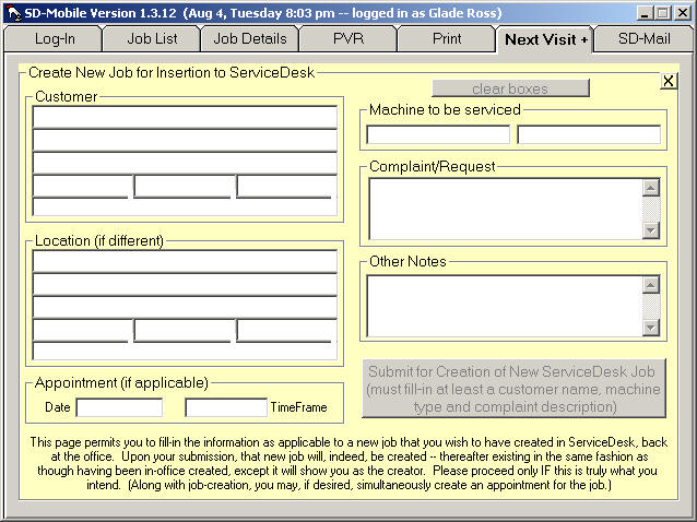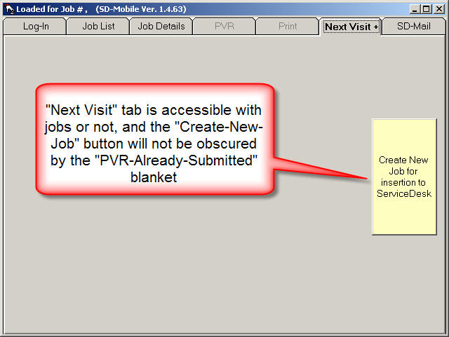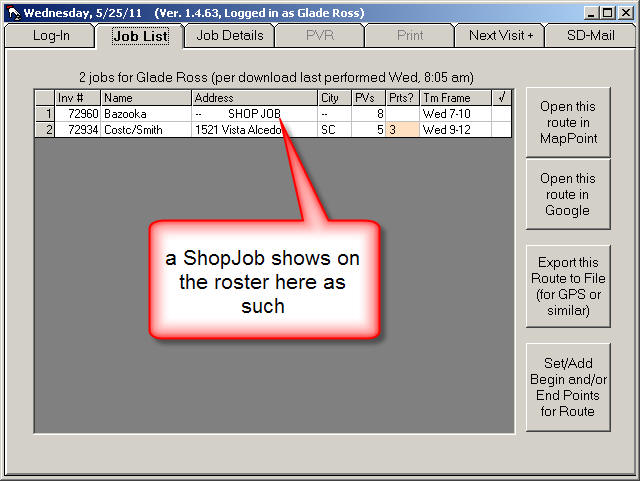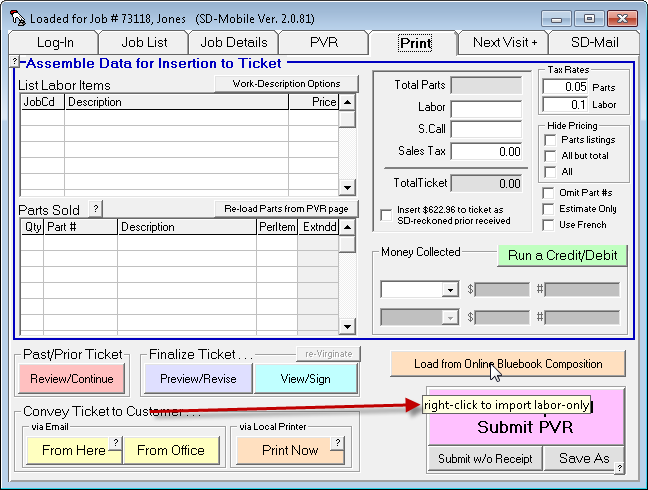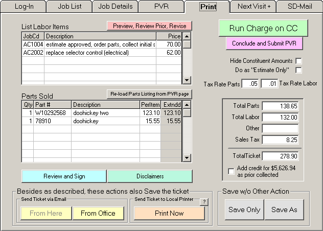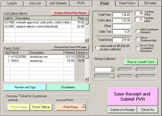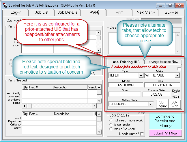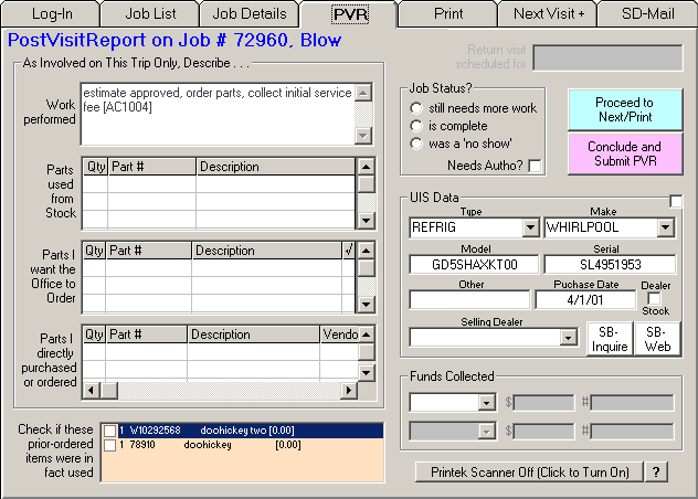 The last two tabs in the SD-Mobile interface are not yet operational at all (Print and SD-Mail). You'll notice there's a column in the JobsList to indicate quantity of parts the tech should be bringing in connection with the job. That likewise is not yet operational.