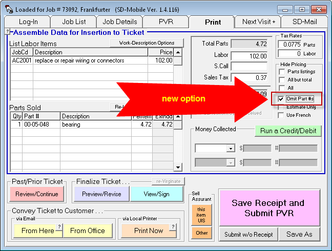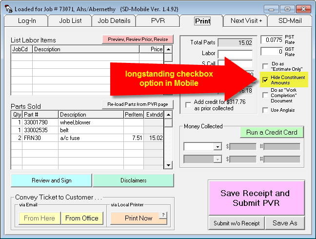 2. On the Mobile end, this release makes operative the "Hide Constituent Amounts" option on the Print page. Now, if the tech "checks" that option, the printout will indeed show only the total figure (as far as money/charge items are concerned).