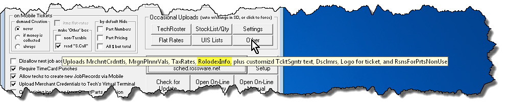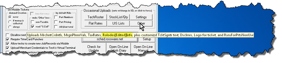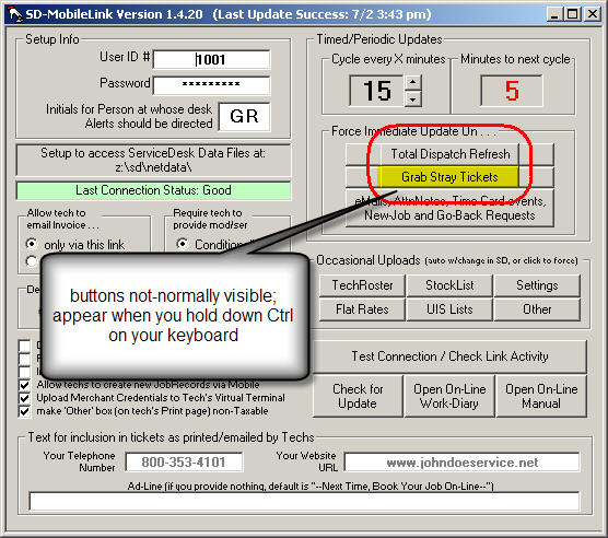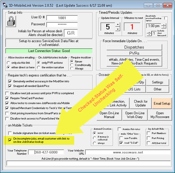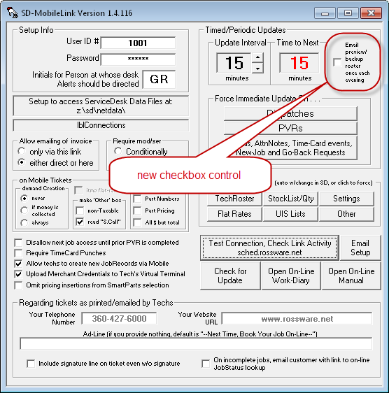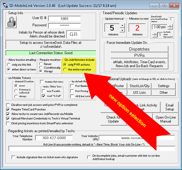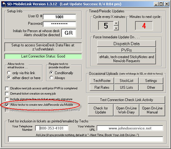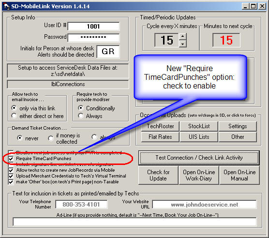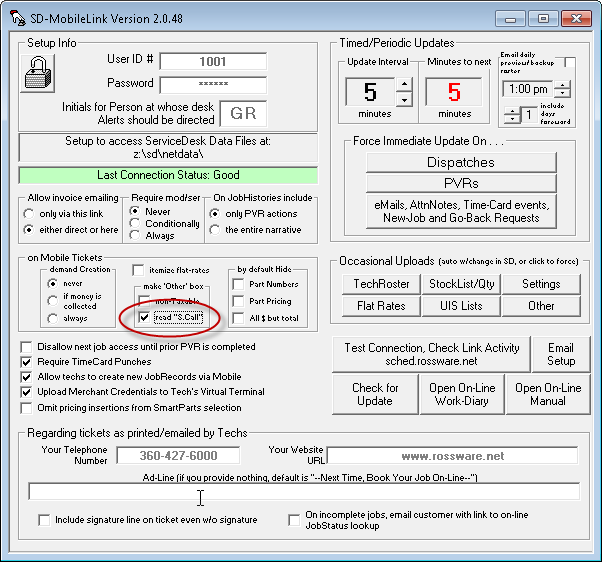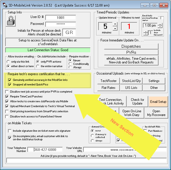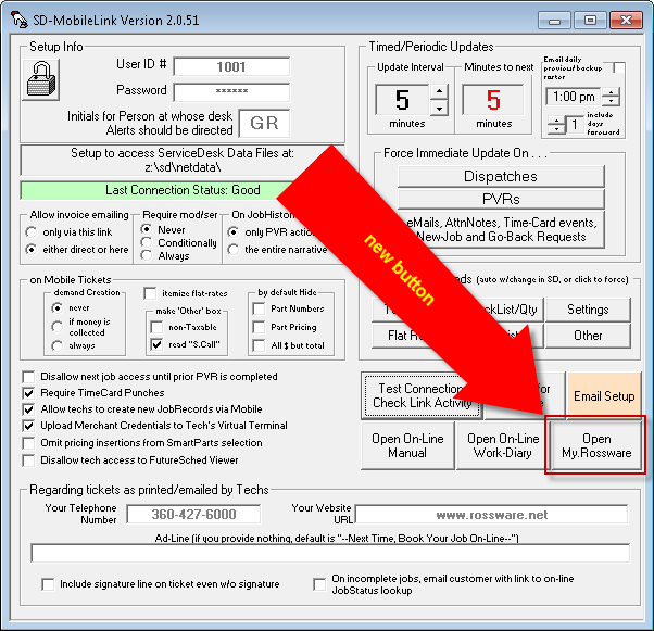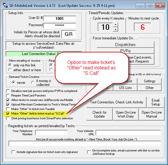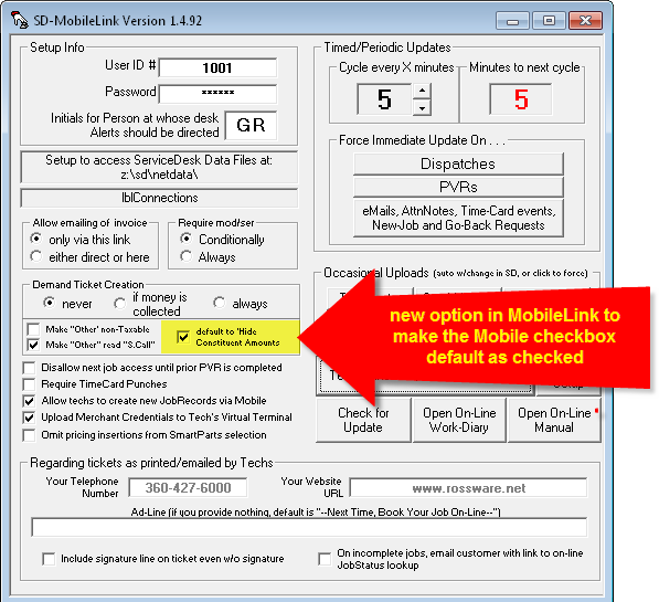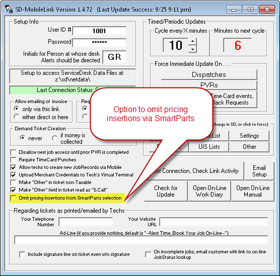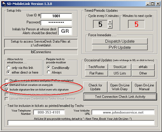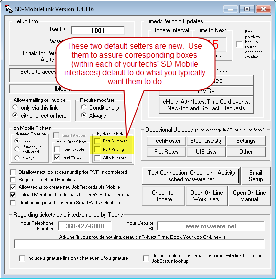 On the SD-MobileLink side, you'll see there are now boxes for you to fill-in the telephone number and website url that you want to include, when your tech remotely prints a ticket. Also, there's an option to indicate whether the tech should be required to provide model and serial in all instances, versus only in those particular situations (e.g., warranty, third-party-payer, ordering parts, etc.) where model and serial are more likely to be required. A warning on this last one: while it's operational on the SD-MobileLink end, I've not yet added corresponding functionality on the SD-Mobile side.