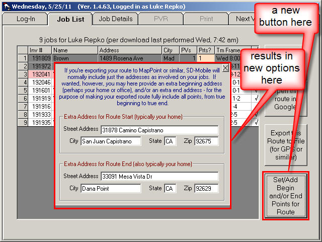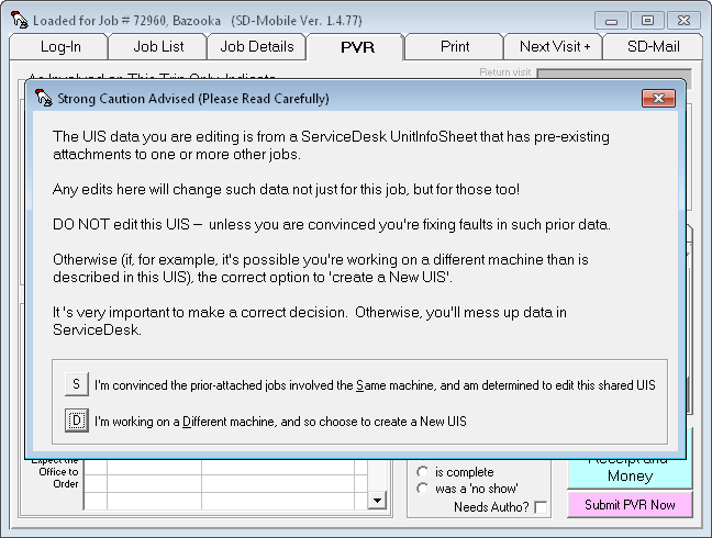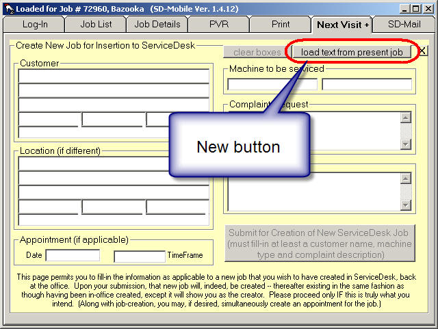 3. SD-Mobile's Description-of-Work-Performed box may now be auto-filled on the basis of JobCodes. This requires a little explanation. In the last release, we added the ability to use JobCodes when auto-filling the Labor-Items-To-Print box. With a succession of line items filled in there, you ended up with, substantially, a description of work performed -- which meant potential redundancy vis-a-vis the Description-of-Work-Performed box. But, on the other hand, a tech might want to describe his work in a different manner than the itemization of labor items that he's charging for. Given the above, we decided to allow it to be done either way.
