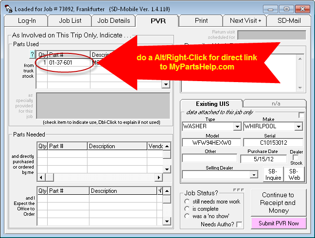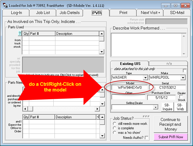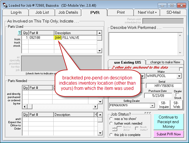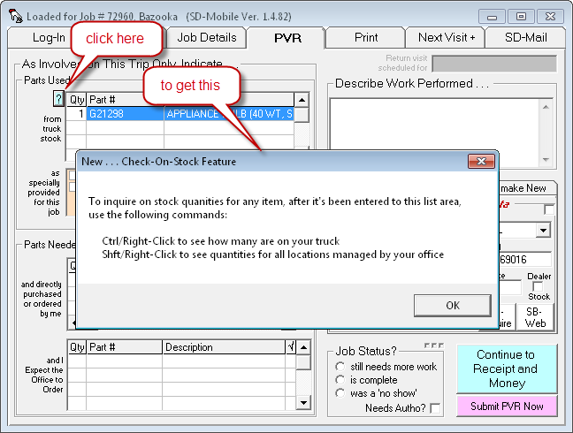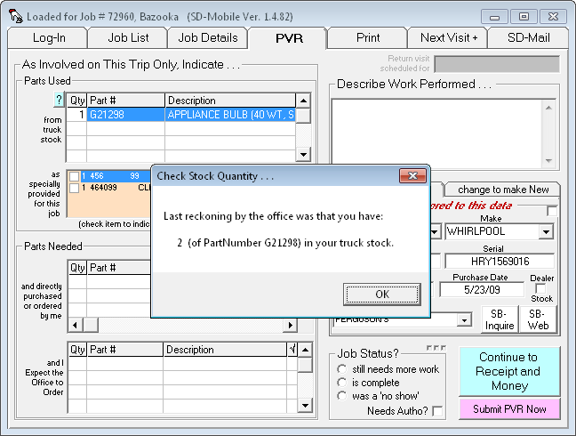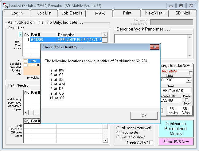 4. In connection with #3 (above), when the SD-MobileLink utility downloads the tech's PVR data, it will now react appropriately to indications of stock items used by actually pulling those items from inventory.