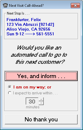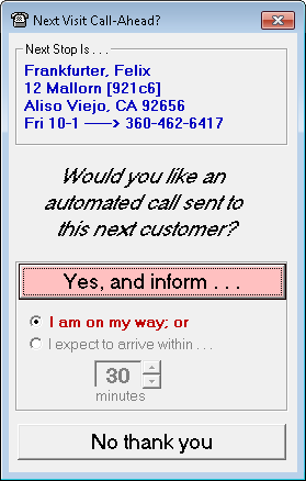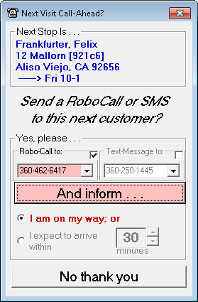In particular, though we like to use language (in the RoboCall scripts, in particular) indicating that the tech "is just finishing his prior job," such language is inapt when the call-ahead is to the first stop in the tech's roster for the day. Not only is it inapt, it could potentially upset a customer if that customer has been told their appointment will be first in the tech's roster for the day.