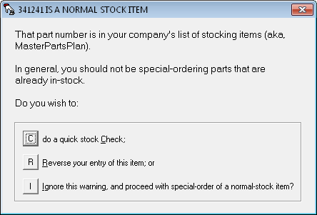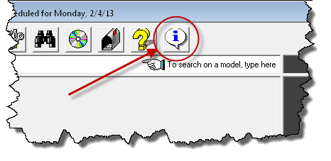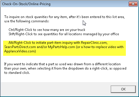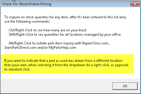 Assuming that your MasterPartsPlan within ServiceDesk has an indicated bin location for either trucks or office, that information will now display when you do a stock-quantities inquiry in SD-Mobile. If by any chance you do not know, a stock-quantities inquiry is initiated by doing a Ctrl/Rt-Click on a partnumber as inserted to a "Parts Used" box within the PVR page (for an inquiry regarding solely your truck) or a Shift/Rt-Click for an inquiry regarding all of your operation's stocking locations. If you forget these commands, the little button as shown here will remind you: