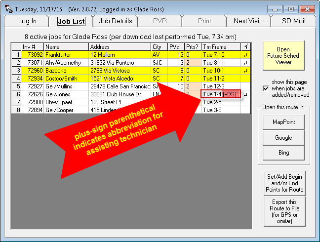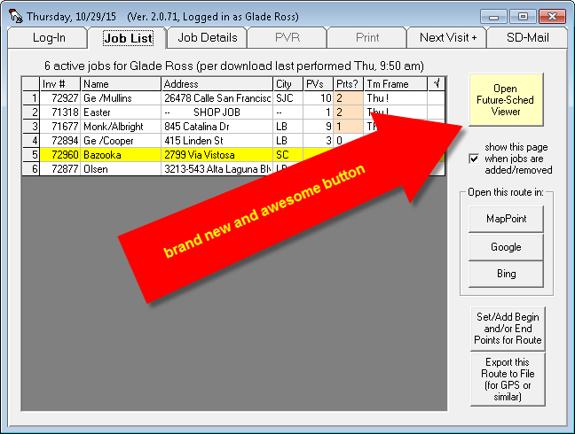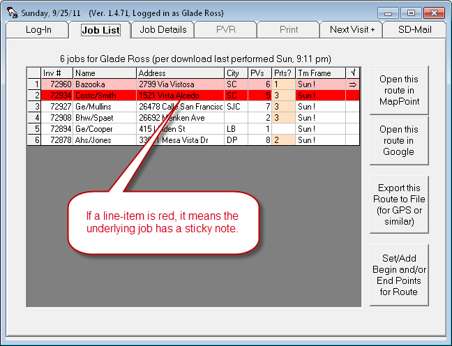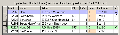 6. Color-coding in JobList. Besides the check-off symbols (i.e., to indicate whether a job is in tech-arrived, tech-finished, PVR-done, etc., status, there are now colors to provide further visual, at-a-glance assistance.