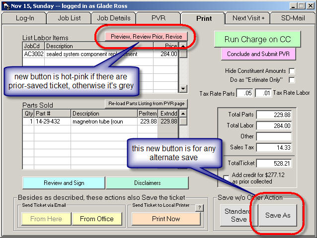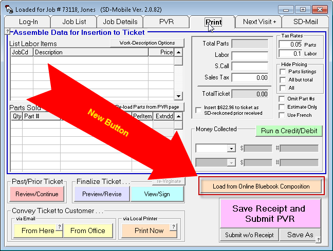 1. Printing a Ticket for the Customer. Yes, indeed, the tech can now print a ticket for the customer, in the field, via SD-Mobile. It's pretty good too, though not fully complete and perfect quite yet. As I type this now, for example, I realize that I've not yet given any effect to a couple of check boxes you'll see on the printing page (one labeled "Hide Constituent Amounts" and the other labeled "Print as Estimate Only)." Regardless, those are only minor embellishments. There is full-fledged printing power there right now, and if you check it out I think you'll find it's rather awesome.