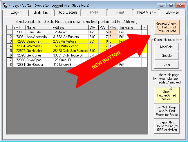 As you can see, this new interface presents a comprehensive, one-place-to-look list of all the parts the tech should have with him, as specifically connected to his entire roster of jobs. Moreover, as he checks in his "tote" or similar to verify the presence of each such item, he can click in the list, to place a checkmark next to each item, thereby signifying he has confirmed its presence. Thus, as he concludes the process, it will be easy to see any item he may be missing.