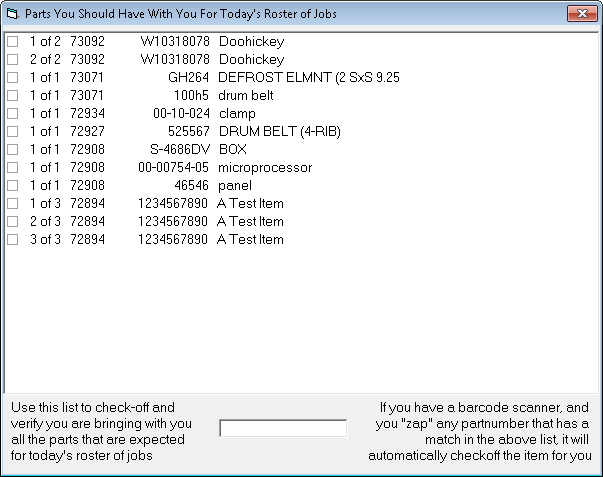 Even better than the above, if your tech is equipped with a barcode scanner, he can simply "zap" each part (i.e., each such part as he finds in his "tote" or similar) with the scanner. With each such "zap," the system will itself find the item in the list and check it off for him. Thus, he can very easily go zap, zap, zap on each item in his tote, then look to see if there is any item in the list that has not been checked off. If so, he'll then know he needs to look into acquiring that missing item.