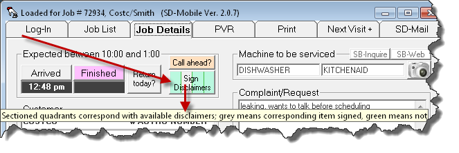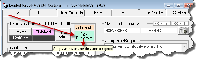 Thus, there is now a mechanism whereby you can make any of your particular disclaimers mandatory (i.e,. the Mobile interface requires your technician to have the customer sign). You can make a disclaimer mandatory for all jobs, or selectively for jobs that involve particular machine types. Instructions are contained in a footnote within the SD-Mobile Handbook (it's possible in the future the location of this footnote will change, but presently it's footnote 11 at the bottom of page 15):