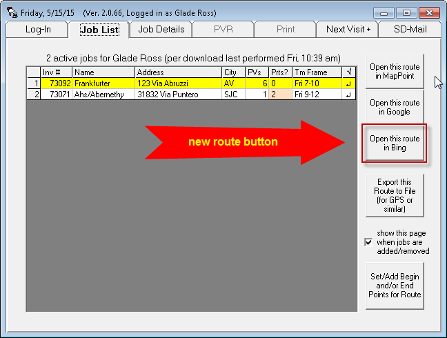 1. PartsPickList functionality is now added. Previously, on the SD-Mobile JobList page, column six just had dashes (they were like "dummy" buttons on a car). In place of the dashes, you'll now see spaces there are either blank (meaning that for such a job there are no particular parts that the tech needs to take with him) or there will be a simple number, which indicates the quantity of parts, for that job, that the tech should be taking. These could be either parts that were previously special-ordered for the job, or parts that were speculatively transferred from inventory. If the tech clicks in this column on any job reference, the system will show an actual listing of the parts involved.