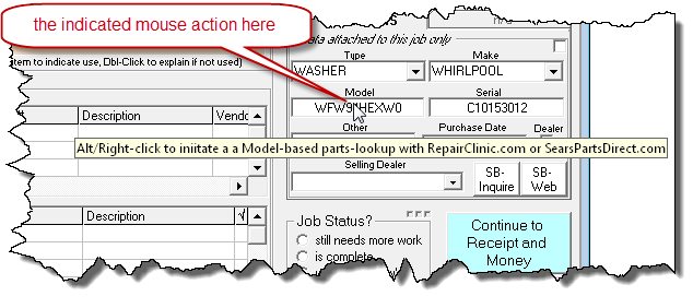 Specifically, as before, the tech can type whatever he wishes to type in the Description-of-Work-Performed box. He can also input line items to the Labor-Items-To-Print box, just as before (i.e., by left-clicking from the drop-down, and of course this assumes you've equipped the system with a flat-rate list). But if he wants his insertions to also populate the Description-of-Work-Performed box with corresponding text, then all he has to do (as he selects any particular labor item), is right-click instead of left. Of course, he can edit the Description-of-Work-Performed box afterward, if desired.