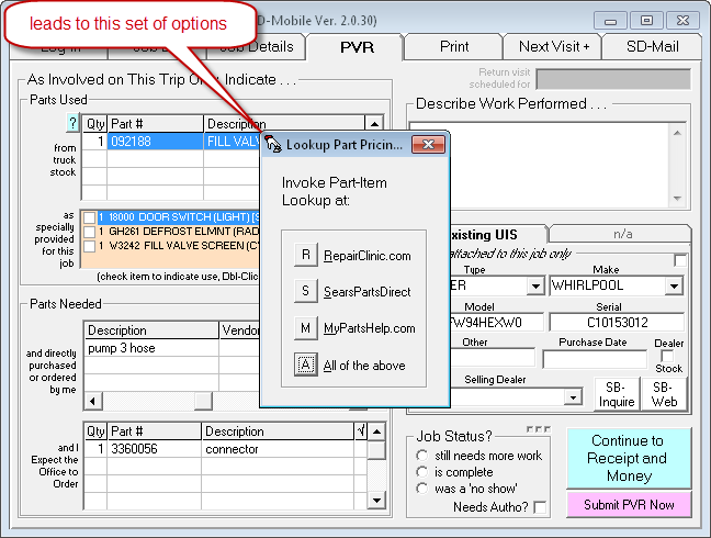 1. There is now a drop-down list in SD-Mobile's Parts-To-Special-Order box. The list is based on SmartParts data, which the system will prompt the tech to download. There's only need to download once (at least pending future updates), and it's a bit time-consuming (maybe as much as 30 minutes or more). I'd intended to put in a progress bar for the purpose, but as I write this I'm realizing I didn't get that done yet. Rather than delaying, I'm providing as is. The system will prompt the tech for the download, and will inform when it's done. At this time, you do not need to subscribe to SmartParts in order to use this.