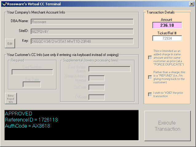 Rossware clients no longer have any need to purchase (or lease) credit card terminals. Nor is there any need, once it's known within a Rossware application that a credit card transaction needs to run, to enter amount and ticket data to a separate interface, run it there, then enter back reference number, etc. Instead, it's all perfectly integrated into a single, seamless sequence and context -- just as it should be.